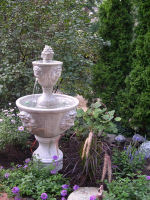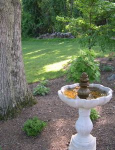 Bubbling Bird Bath Fountain Beneath an Oak Tree with Hydrangeas, Ferns, Astilbes and Hostas.