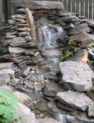 Split streams with 4 waterfalls, waterplants, lighting for pond and border garden.