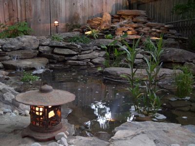 Organic Shape Pond With Copper Fish Spout and Waterfall. Copper Lighting fixtures around garden and Inside Pond.