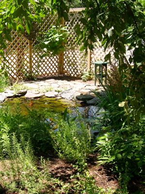 Organic corner patio with lattice to block view of busy street and creates private space for fish pond