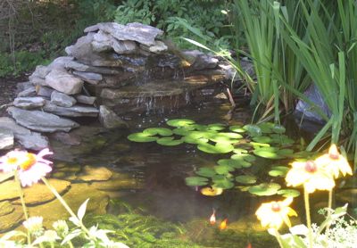 Fishpond with waterfalls, split streams and border garden.