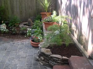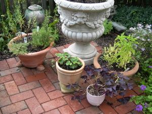 Patio Corner with herbs, and though you can't see it, the big lion head vase holds a grape vine