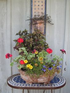 Mosaic table and wall sconce with antique cement pot and living floral arrangements