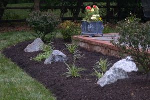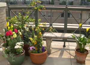 Backyard patio at the Portsmouth Apts. with assorted flowers and a fire-pot