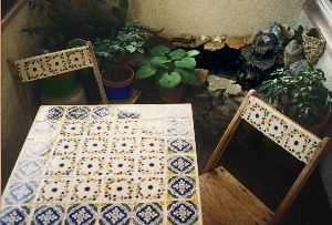 This 6'x12' porch has a pond with waterfall, colorful pottery with herbs and flowers and a mexican tiled table with matching chairs