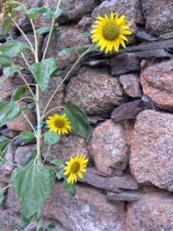 But here, While my garden counts the seasons Framed by the old stone wall, The grace of the sunflower summons, Grows alone, strong and tall.